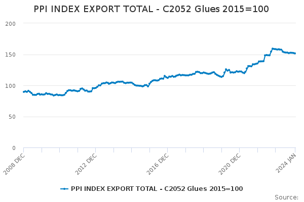 Download this time seriesPPI INDEX EXPORT TOTAL - C2052 Glues 2015=100