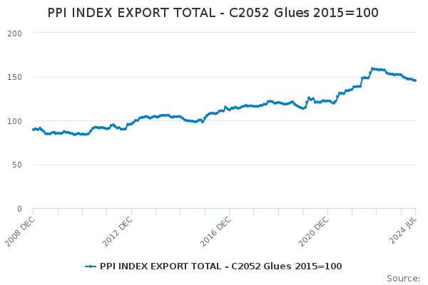 Download this time seriesPPI INDEX EXPORT TOTAL - C2052 Glues 2015=100