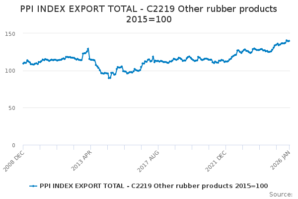 Download this time seriesPPI INDEX EXPORT TOTAL - C2219 Other rubber products 2015=100