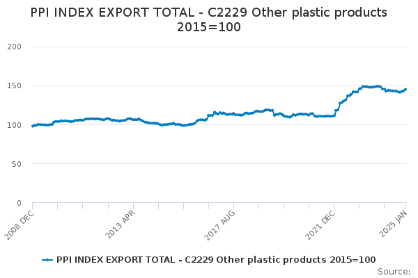 Download this time seriesPPI INDEX EXPORT TOTAL - C2229 Other plastic products 2015=100