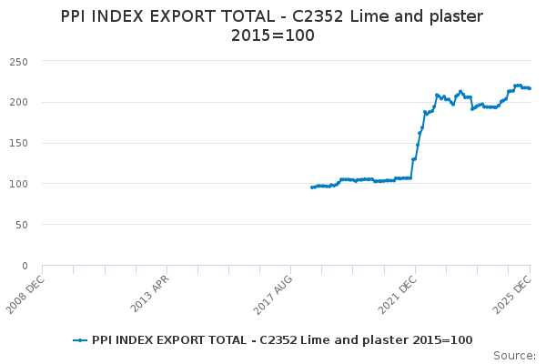 Download this time seriesPPI INDEX EXPORT TOTAL - C2352 Lime and plaster 2015=100