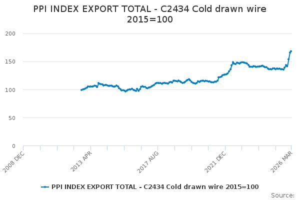 Download this time seriesPPI INDEX EXPORT TOTAL - C2434 Cold drawn wire 2015=100