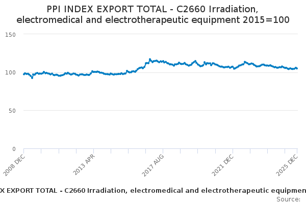 Download this time seriesPPI INDEX EXPORT TOTAL - C2660 Irradiation, electromedical and electrotherapeutic equipment 2015=100