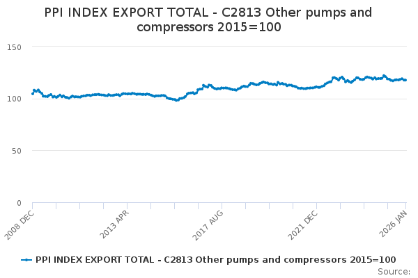 Download this time seriesPPI INDEX EXPORT TOTAL - C2813 Other pumps and compressors 2015=100