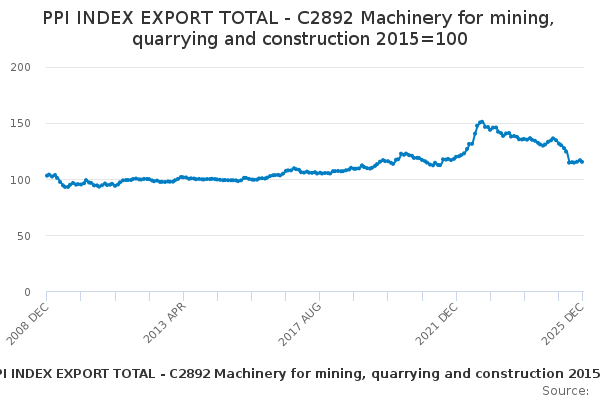 Download this time seriesPPI INDEX EXPORT TOTAL - C2892 Machinery for mining, quarrying and construction 2015=100