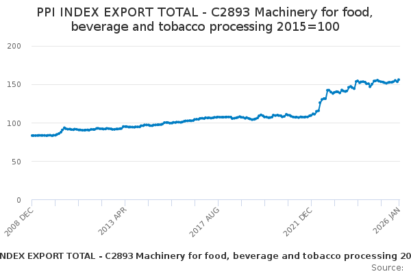 Download this time seriesPPI INDEX EXPORT TOTAL - C2893 Machinery for food, beverage and tobacco processing 2015=100
