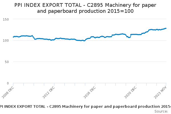 Download this time seriesPPI INDEX EXPORT TOTAL - C2895 Machinery for paper and paperboard production 2015=100