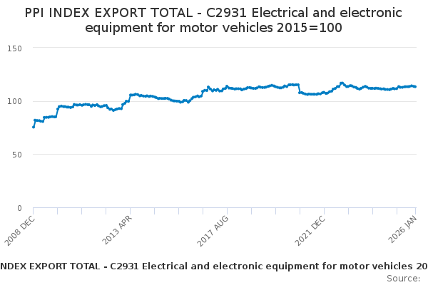 Download this time seriesPPI INDEX EXPORT TOTAL - C2931 Electrical and electronic equipment for motor vehicles 2015=100