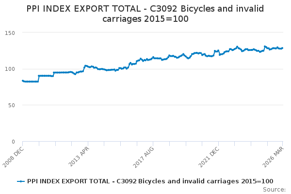 Download this time seriesPPI INDEX EXPORT TOTAL - C3092 Bicycles and invalid carriages 2015=100
