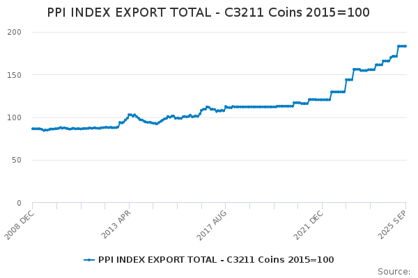 Download this time seriesPPI INDEX EXPORT TOTAL - C3211 Coins 2015=100
