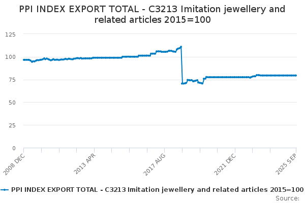 Download this time seriesPPI INDEX EXPORT TOTAL - C3213 Imitation jewellery and related articles 2015=100