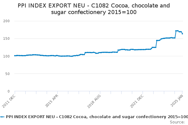 Download this time seriesPPI INDEX EXPORT NEU - C1082 Cocoa, chocolate and sugar confectionery 2015=100