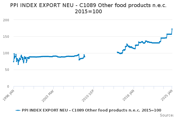 Download this time seriesPPI INDEX EXPORT NEU - C1089 Other food products n.e.c. 2015=100