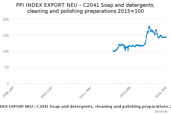 Download this time seriesPPI INDEX EXPORT NEU - C2041 Soap and detergents, cleaning and polishing preparations 2015=100