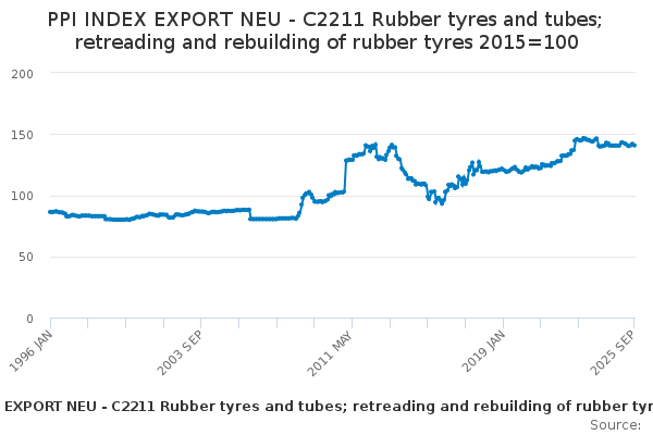 Download this time seriesPPI INDEX EXPORT NEU - C2211 Rubber tyres and tubes; retreading and rebuilding of rubber tyres 2015=100