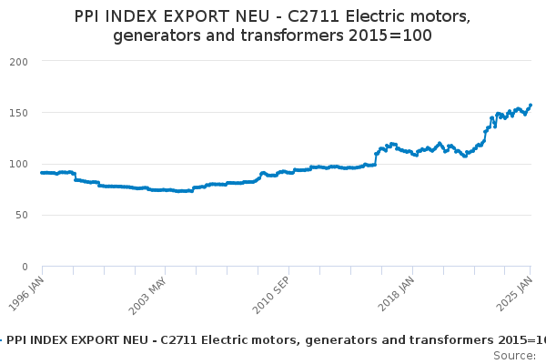 Download this time seriesPPI INDEX EXPORT NEU - C2711 Electric motors, generators and transformers 2015=100