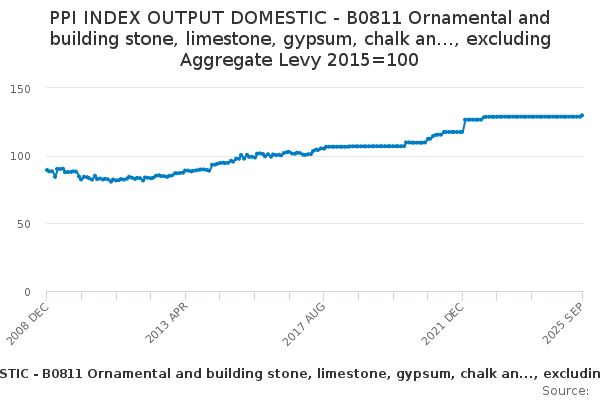 Download this time seriesPPI INDEX OUTPUT DOMESTIC - B0811 Ornamental and building stone, limestone, gypsum, chalk an..., excluding Aggregate Levy 2015=100