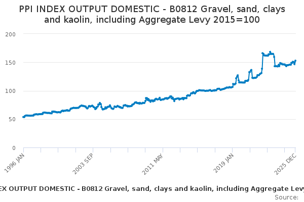 Download this time seriesPPI INDEX OUTPUT DOMESTIC - B0812 Gravel, sand, clays and kaolin, including Aggregate Levy 2015=100
