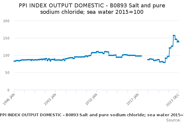 Download this time seriesPPI INDEX OUTPUT DOMESTIC - B0893 Salt and pure sodium chloride; sea water 2015=100