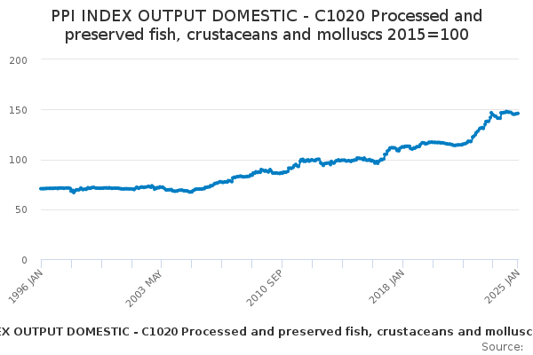 Download this time seriesPPI INDEX OUTPUT DOMESTIC - C1020 Processed and preserved fish, crustaceans and molluscs 2015=100