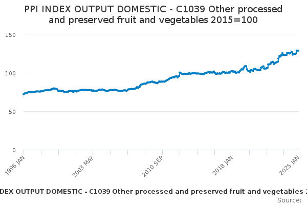 Download this time seriesPPI INDEX OUTPUT DOMESTIC - C1039 Other processed and preserved fruit and vegetables 2015=100
