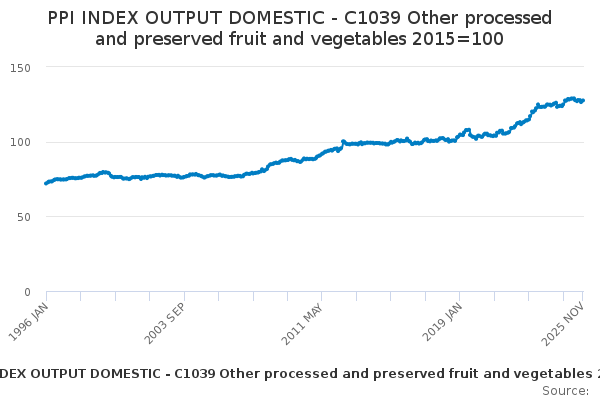 Download this time seriesPPI INDEX OUTPUT DOMESTIC - C1039 Other processed and preserved fruit and vegetables 2015=100