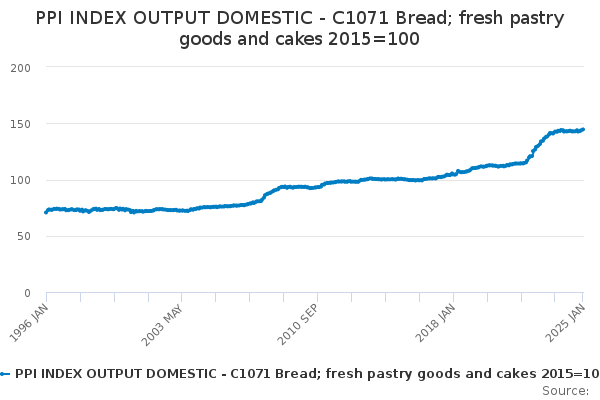 Download this time seriesPPI INDEX OUTPUT DOMESTIC - C1071 Bread; fresh pastry goods and cakes 2015=100