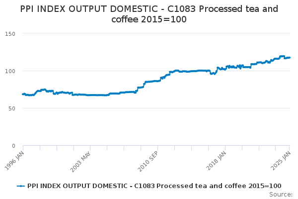 Download this time seriesPPI INDEX OUTPUT DOMESTIC - C1083 Processed tea and coffee 2015=100