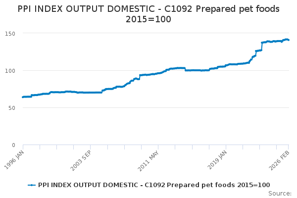 Download this time seriesPPI INDEX OUTPUT DOMESTIC - C1092 Prepared pet foods 2015=100
