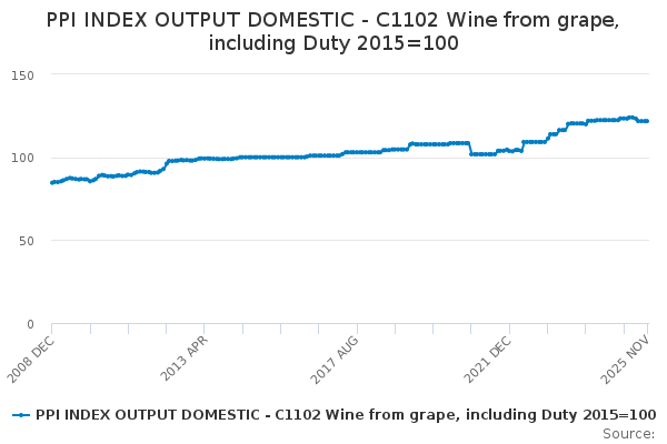 Download this time seriesPPI INDEX OUTPUT DOMESTIC - C1102 Wine from grape, including Duty 2015=100