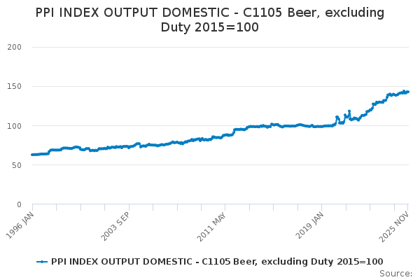 Download this time seriesPPI INDEX OUTPUT DOMESTIC - C1105 Beer, excluding Duty 2015=100