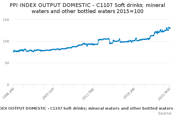 Download this time seriesPPI INDEX OUTPUT DOMESTIC - C1107 Soft drinks; mineral waters and other bottled waters 2015=100
