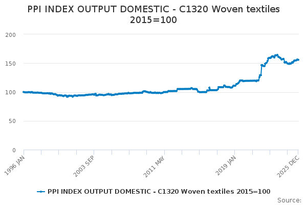 Download this time seriesPPI INDEX OUTPUT DOMESTIC - C1320 Woven textiles 2015=100