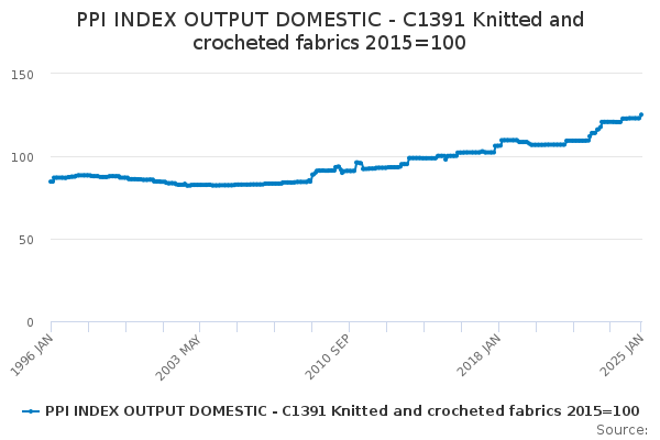 Download this time seriesPPI INDEX OUTPUT DOMESTIC - C1391 Knitted and crocheted fabrics 2015=100