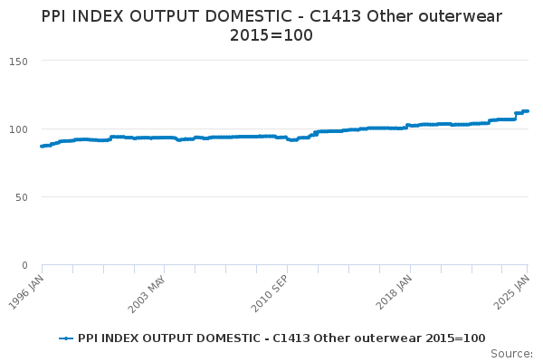 Download this time seriesPPI INDEX OUTPUT DOMESTIC - C1413 Other outerwear 2015=100