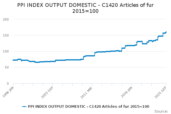 Download this time seriesPPI INDEX OUTPUT DOMESTIC - C1420 Articles of fur 2015=100