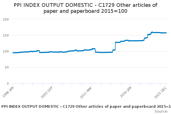 Download this time seriesPPI INDEX OUTPUT DOMESTIC - C1729 Other articles of paper and paperboard 2015=100