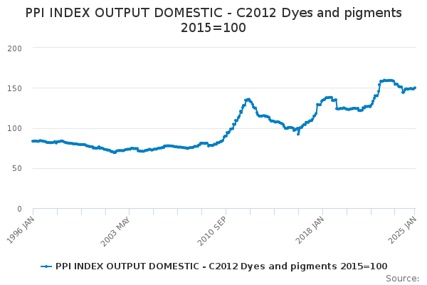 Download this time seriesPPI INDEX OUTPUT DOMESTIC - C2012 Dyes and pigments 2015=100