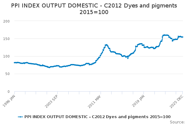 Download this time seriesPPI INDEX OUTPUT DOMESTIC - C2012 Dyes and pigments 2015=100