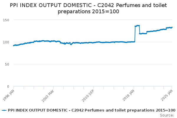 Download this time seriesPPI INDEX OUTPUT DOMESTIC - C2042 Perfumes and toilet preparations 2015=100