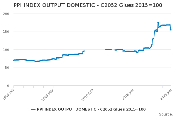 Download this time seriesPPI INDEX OUTPUT DOMESTIC - C2052 Glues 2015=100