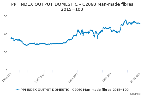 Download this time seriesPPI INDEX OUTPUT DOMESTIC - C2060 Man-made fibres 2015=100