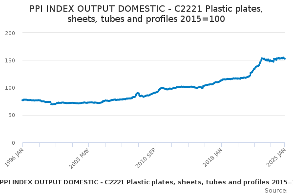 Download this time seriesPPI INDEX OUTPUT DOMESTIC - C2221 Plastic plates, sheets, tubes and profiles 2015=100
