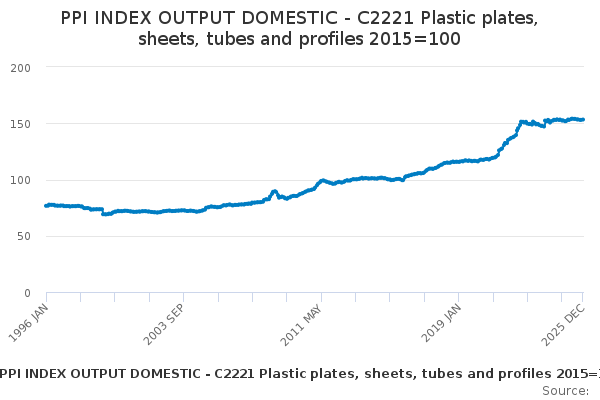 Download this time seriesPPI INDEX OUTPUT DOMESTIC - C2221 Plastic plates, sheets, tubes and profiles 2015=100