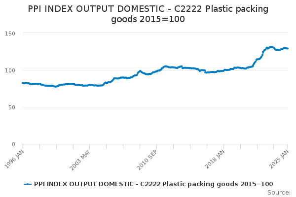 Download this time seriesPPI INDEX OUTPUT DOMESTIC - C2222 Plastic packing goods 2015=100