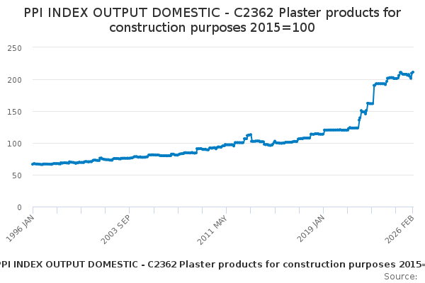 Download this time seriesPPI INDEX OUTPUT DOMESTIC - C2362 Plaster products for construction purposes 2015=100