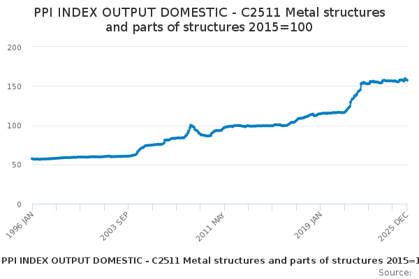 Download this time seriesPPI INDEX OUTPUT DOMESTIC - C2511 Metal structures and parts of structures 2015=100