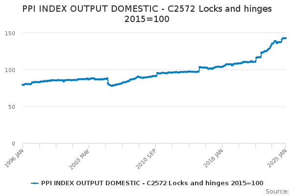 Download this time seriesPPI INDEX OUTPUT DOMESTIC - C2572 Locks and hinges 2015=100