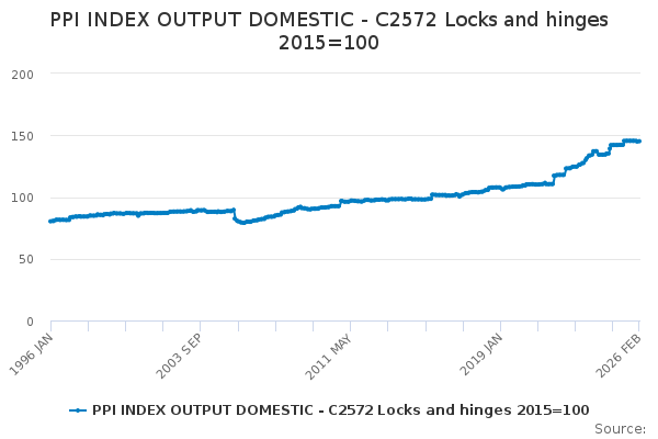 Download this time seriesPPI INDEX OUTPUT DOMESTIC - C2572 Locks and hinges 2015=100