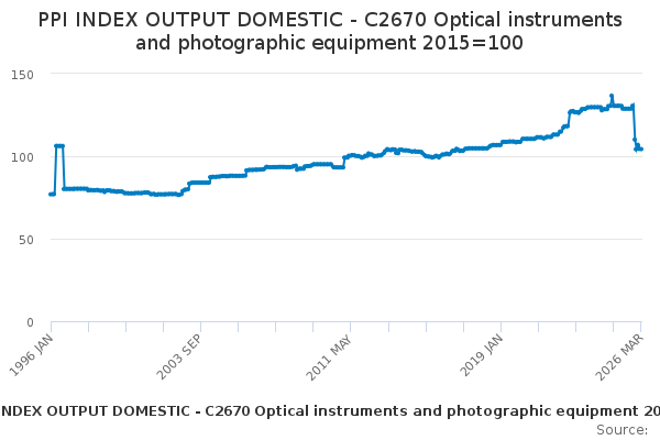 Download this time seriesPPI INDEX OUTPUT DOMESTIC - C2670 Optical instruments and photographic equipment 2015=100